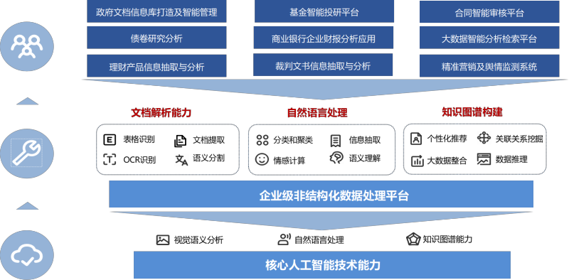 智能必一运动bsport体育的企业级非结构化处理平台主要处理的是文档、影像件等非结构化数据,通过视觉语义分析和自然语言处理,将结构化数据转化为非结构化数据,后续根据不同业务场景对结构化数据进行关联与分析,协助人们快速的阅读、理解和分析各类文档内容,降低企业、政府及各种组织中文档的重复阅读、整理和分析的工作,提升非结构化数据处理效率及数据的流动、共享和使用能力。产品已经实现了金融行业(银行、证券、保险)、烟草、政务、财政税务等行业领域的场景落地,完成了良好的工程实现,并积累了大量的金融、政务和烟草行业市场化训练数据,形成了技术壁垒,可以在这些行业进行良好的拓展。