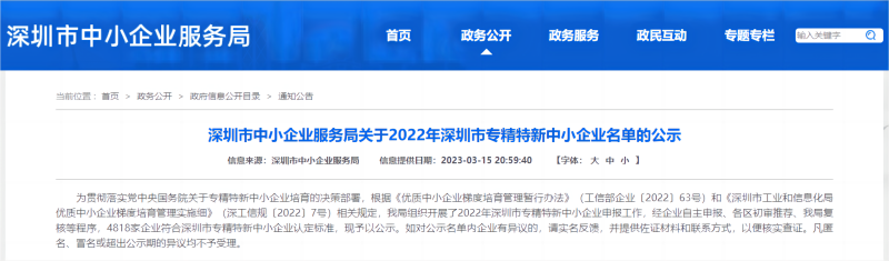2022年深圳市专精特新中小企业公示名单