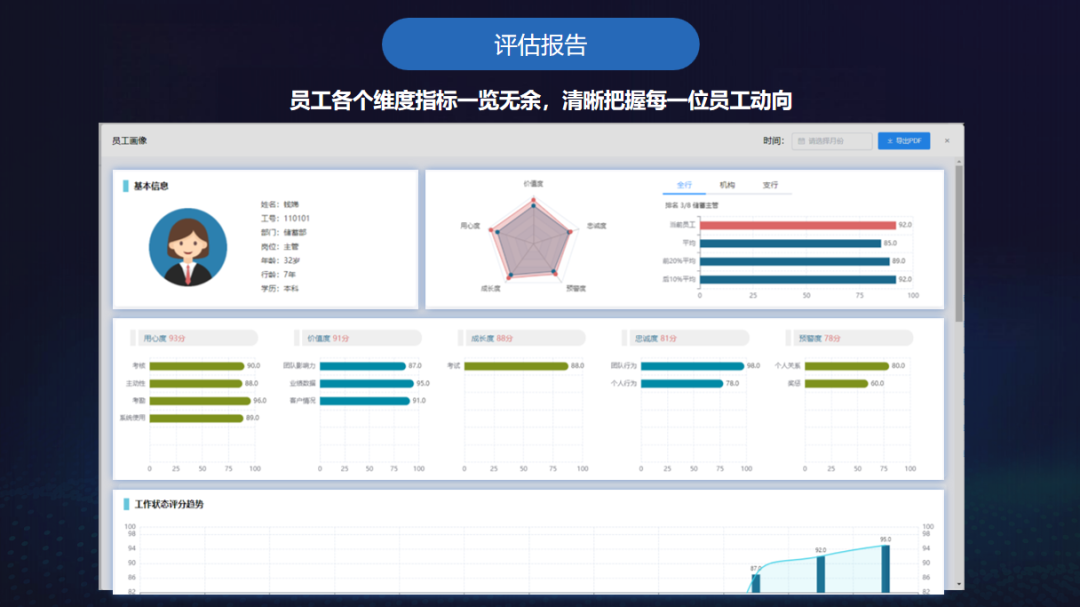 个人评估报告:展示个人工作状态评分、趋势、画像数据,帮助管理者了解员工工作状态和成长潜力。